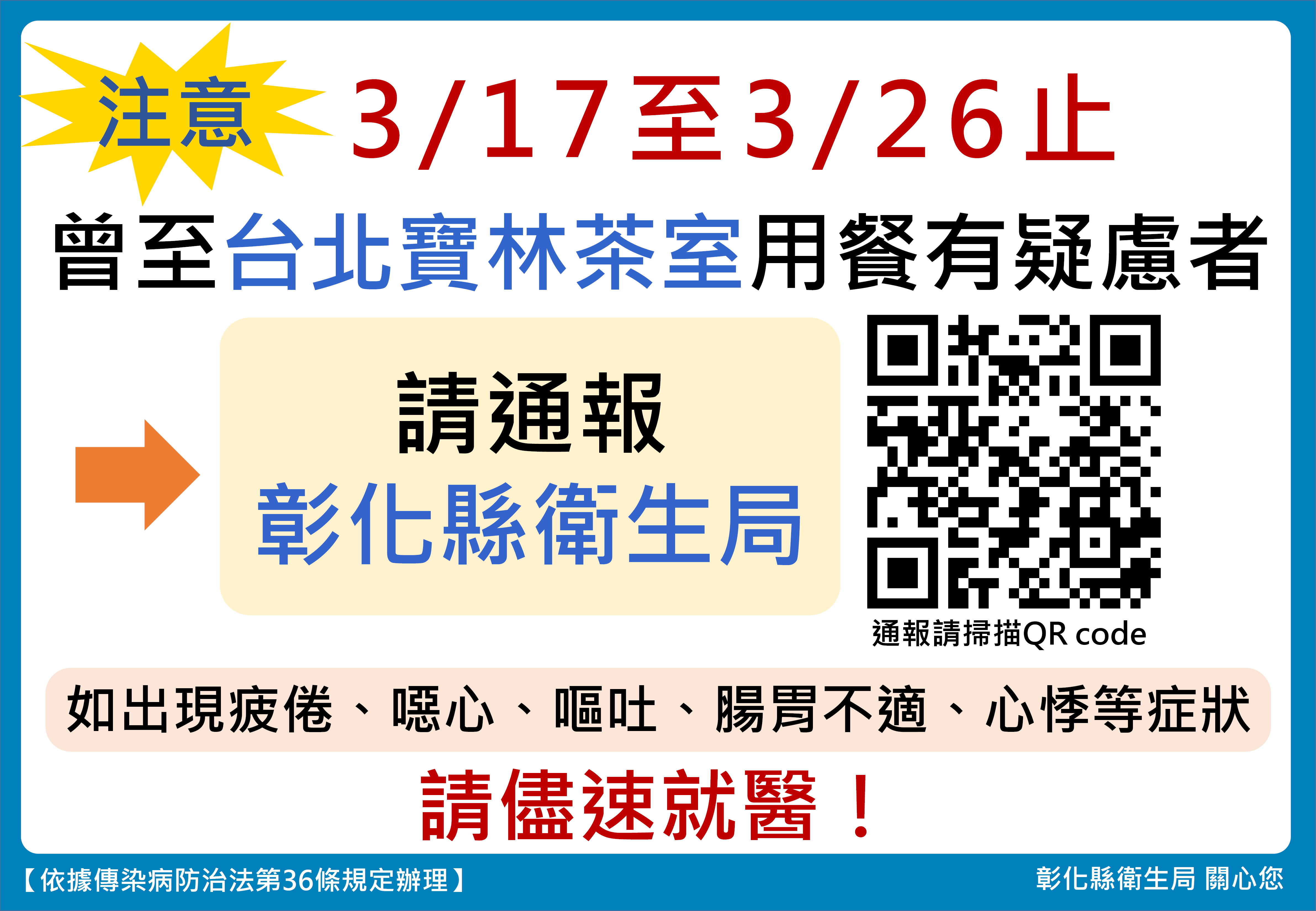 113年3月17日至26日至寶林茶室用餐有疑慮民眾請向衛生局通報